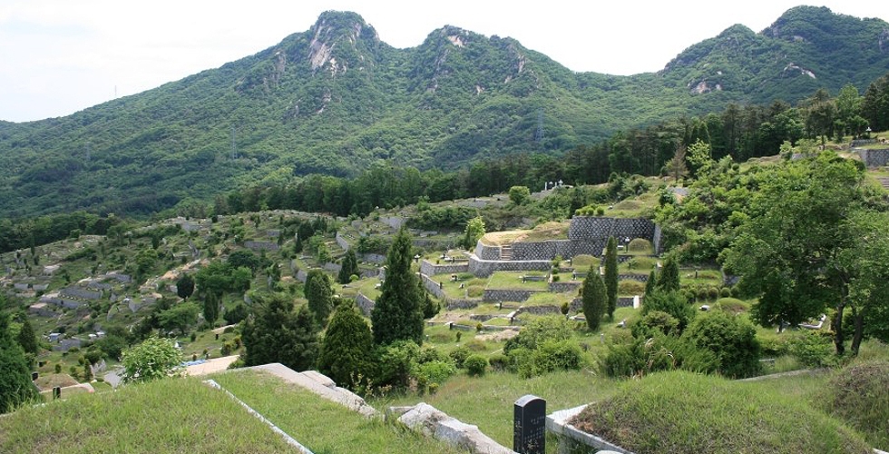 용상골에 위치한 부채꼴 모양의 산 형세로 포근함 있는 공원묘지